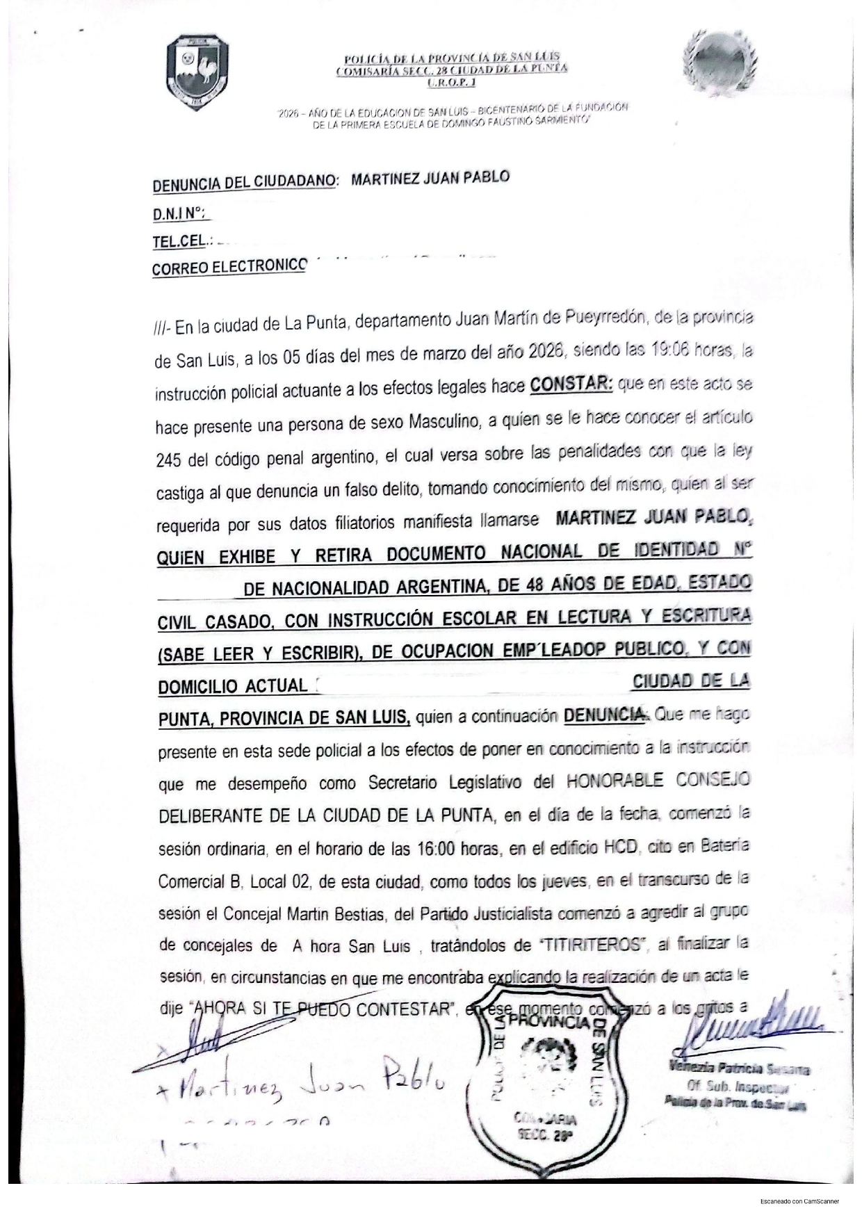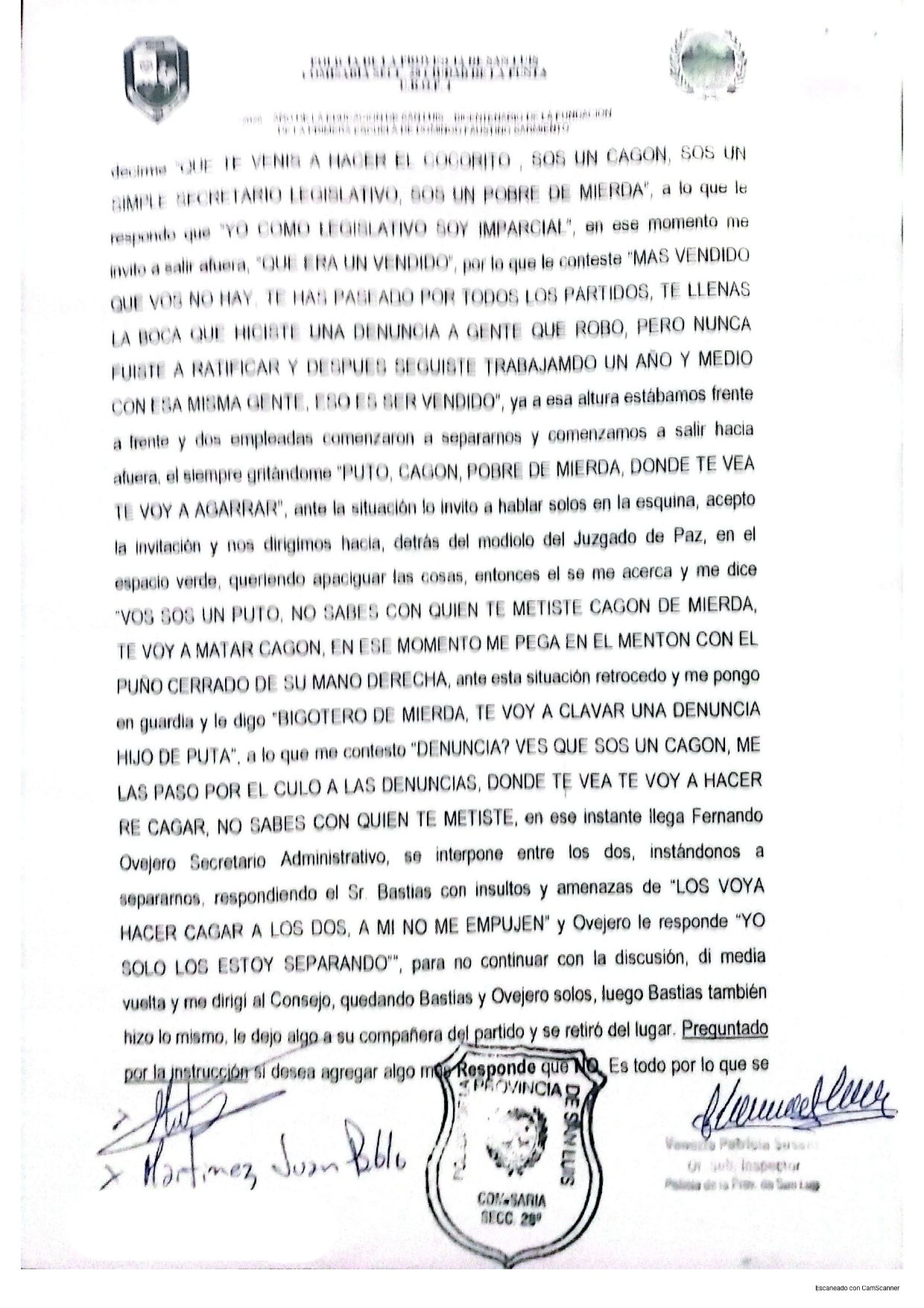 Según lo que trascendió públicamente y lo que consta en una denuncia radicada en la Comisaría 28 de La Punta, el secretario legislativo del cuerpo habría sido víctima de agresiones verbales, amenazas e incluso forcejeos físicos por parte del concejal Bastiás.
